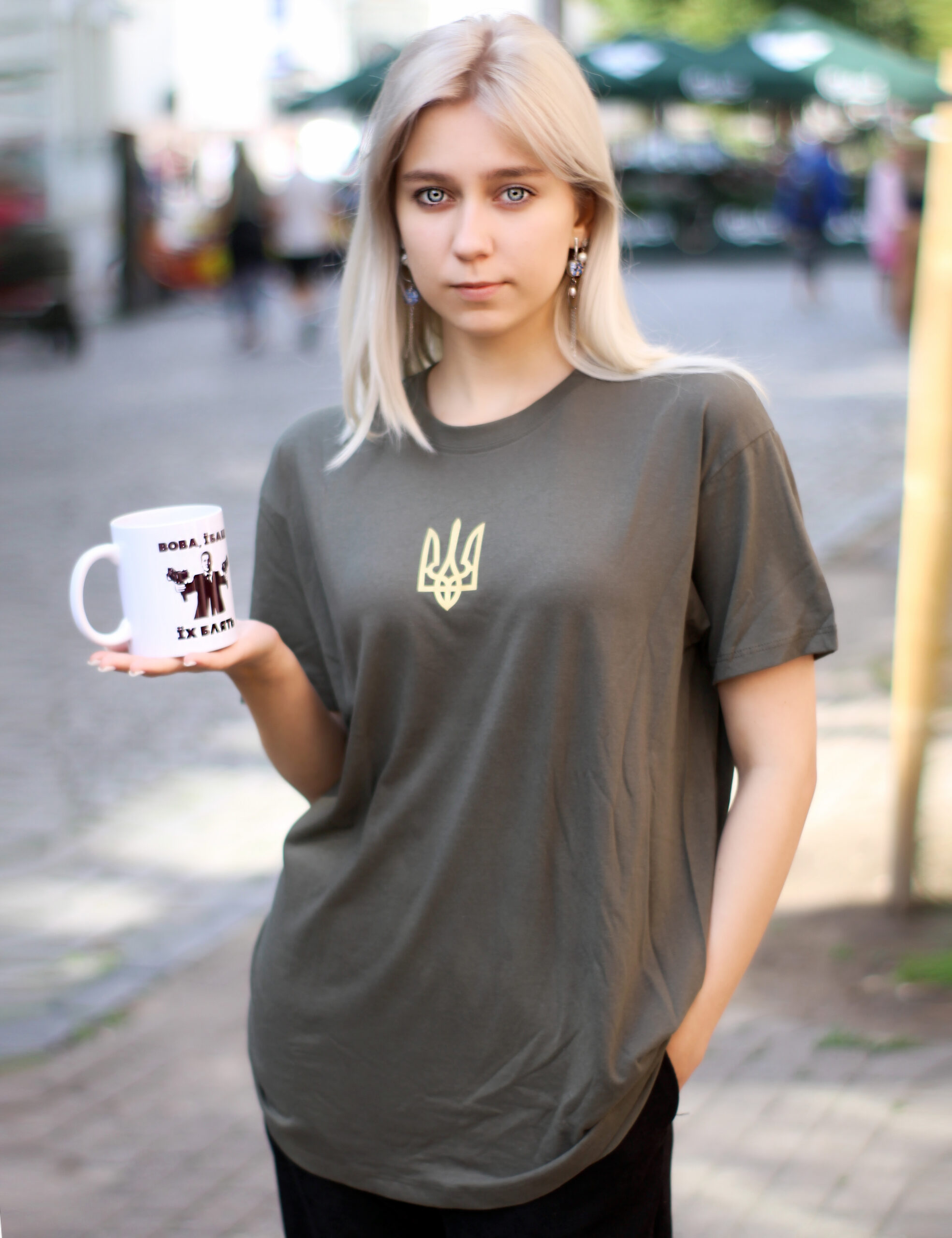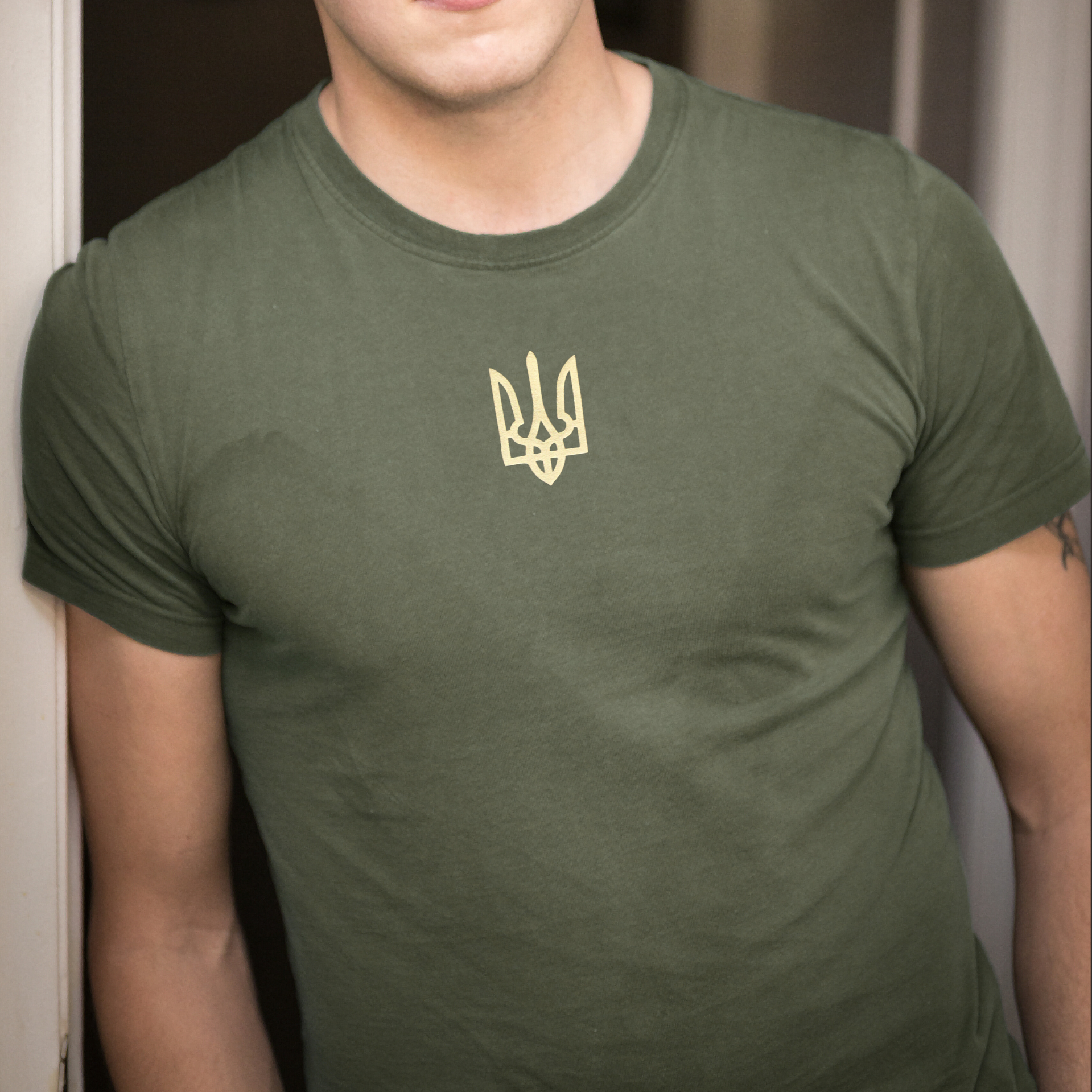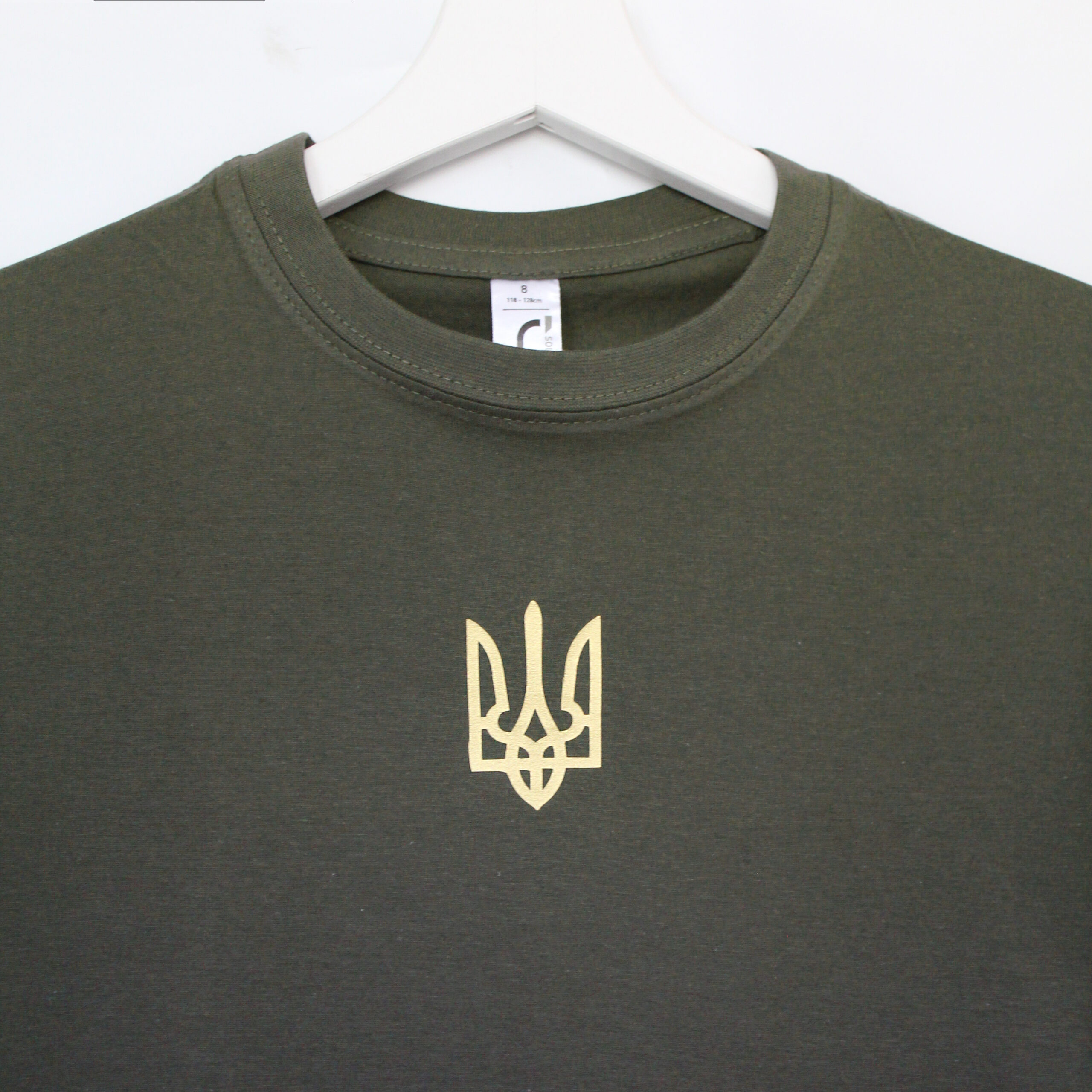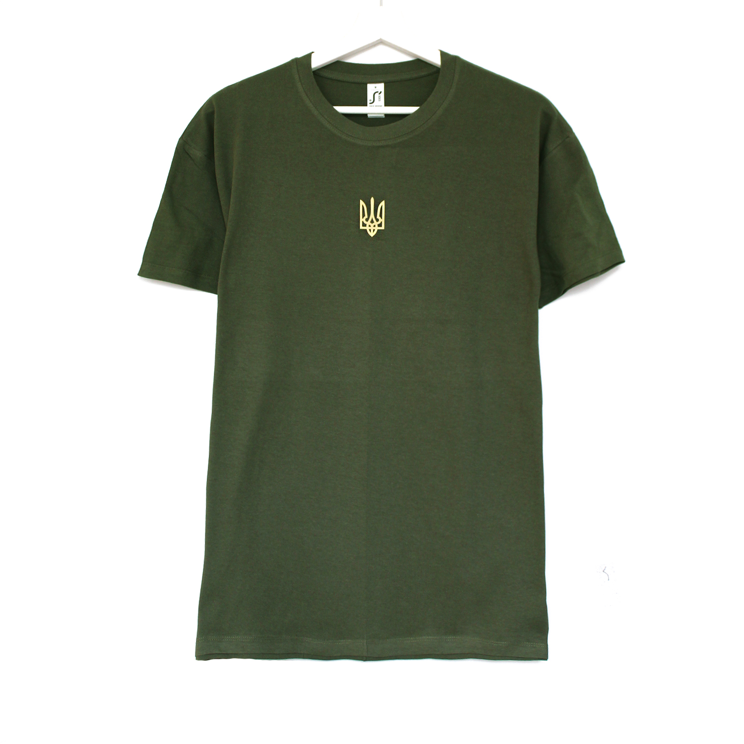 Футболка аліўкавага колеру з невялікім залатым трызубам на грудзях. Мінімалістычны і патрыятычны стыль робіць яе ідэальным выбарам для штодзённага насення.
