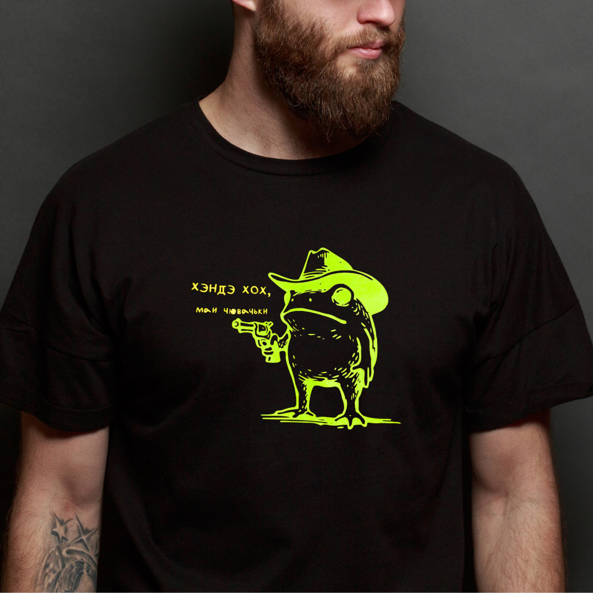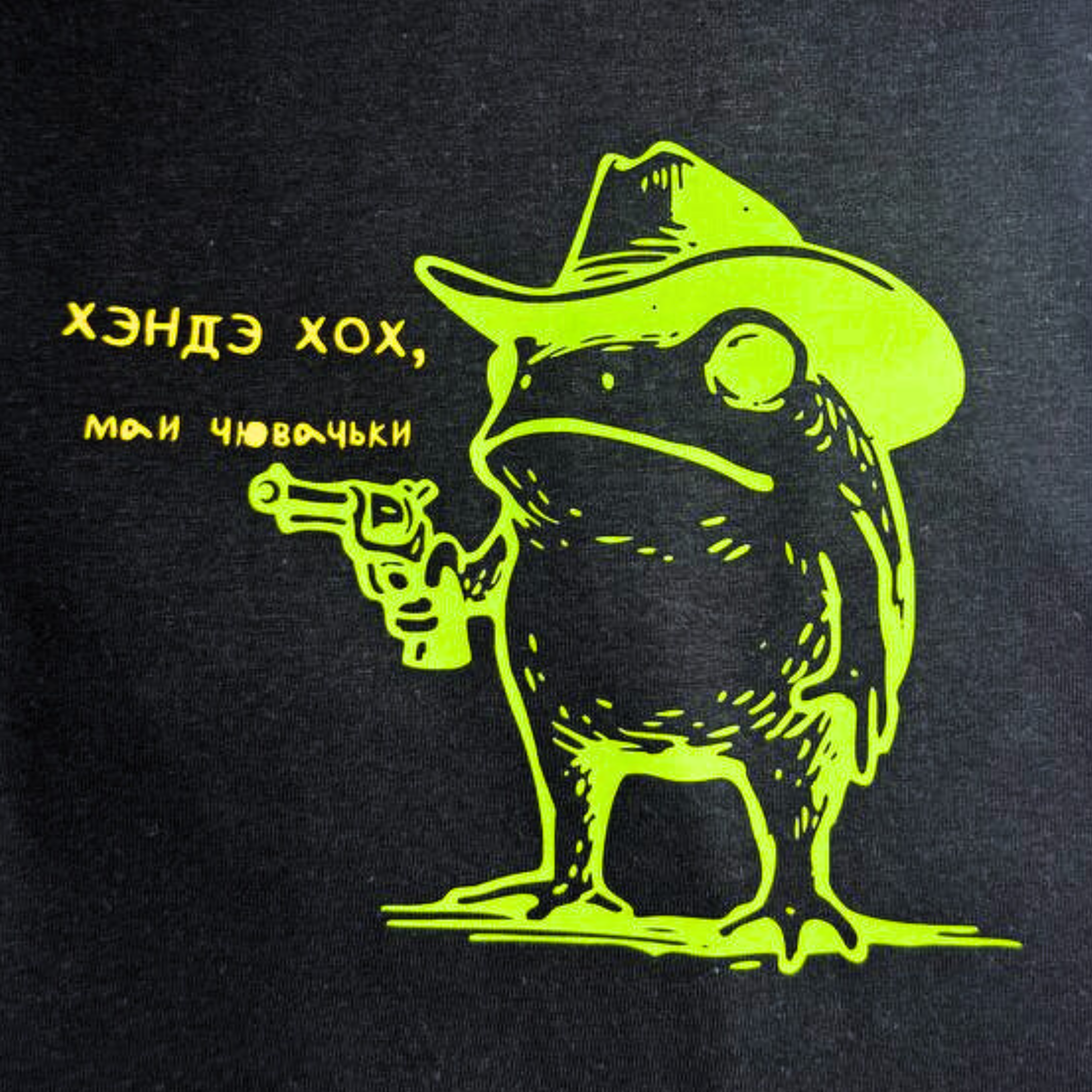 Футболка чорнага колеру з вясёлым прынтам — жаба ў капелюшы і з пісталетам. Неонавы дызайн робіць яе асабліва стыльнай і прыцягальнай. Ідэальна для моладзі і аматараў гумару.