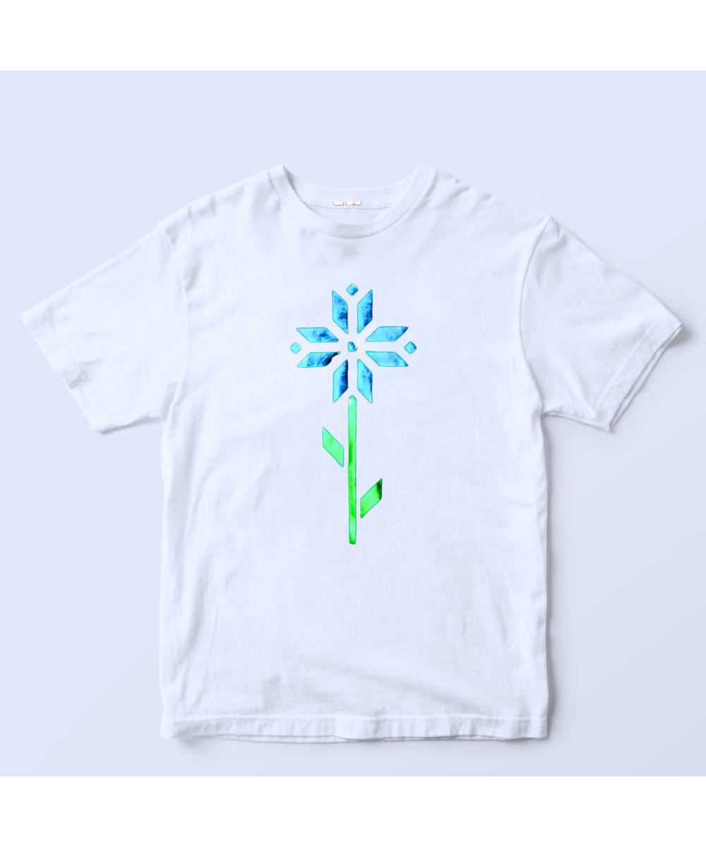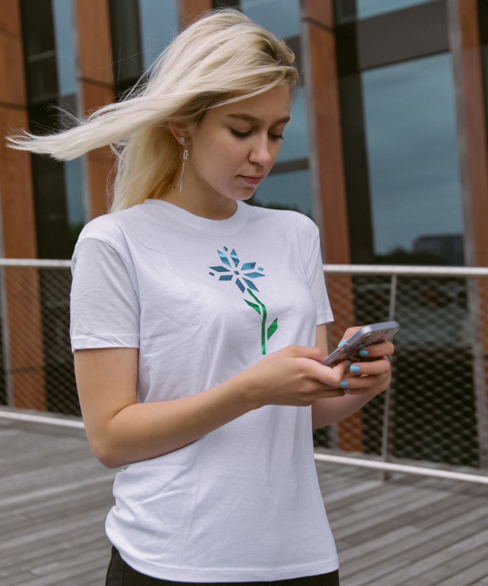 Лаканічная футболка з геаметрычнай кветкай у сініх і зялёных адценнях. Сучасны беларускі этна-мінімалізм у стыльным выкананні.