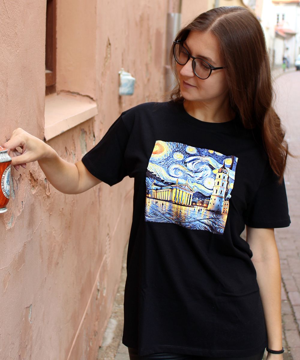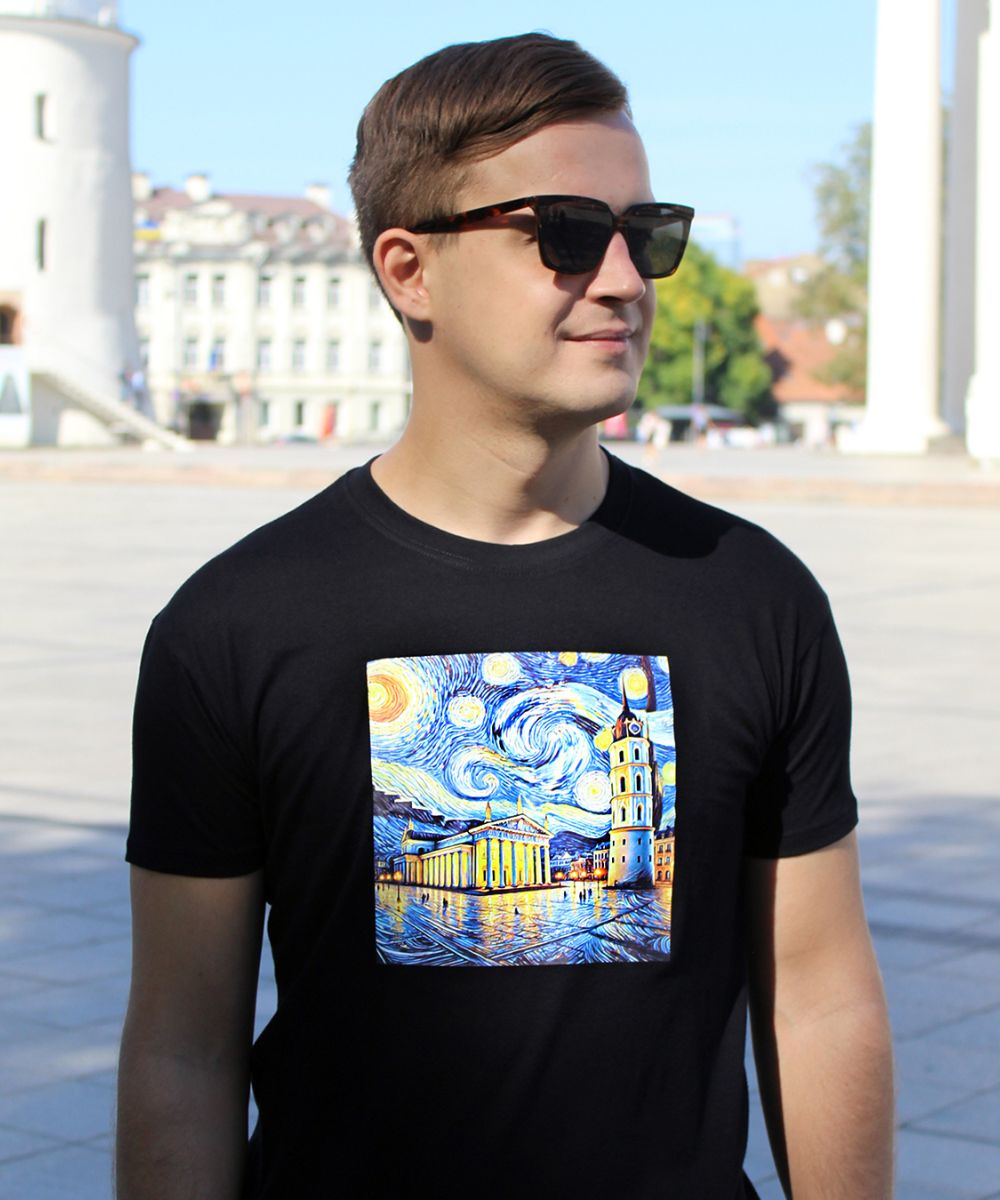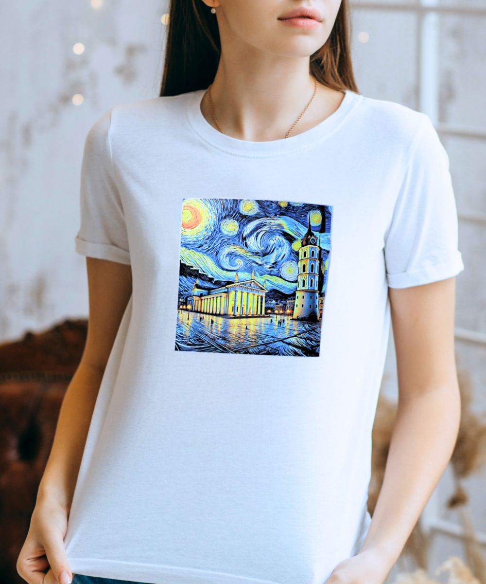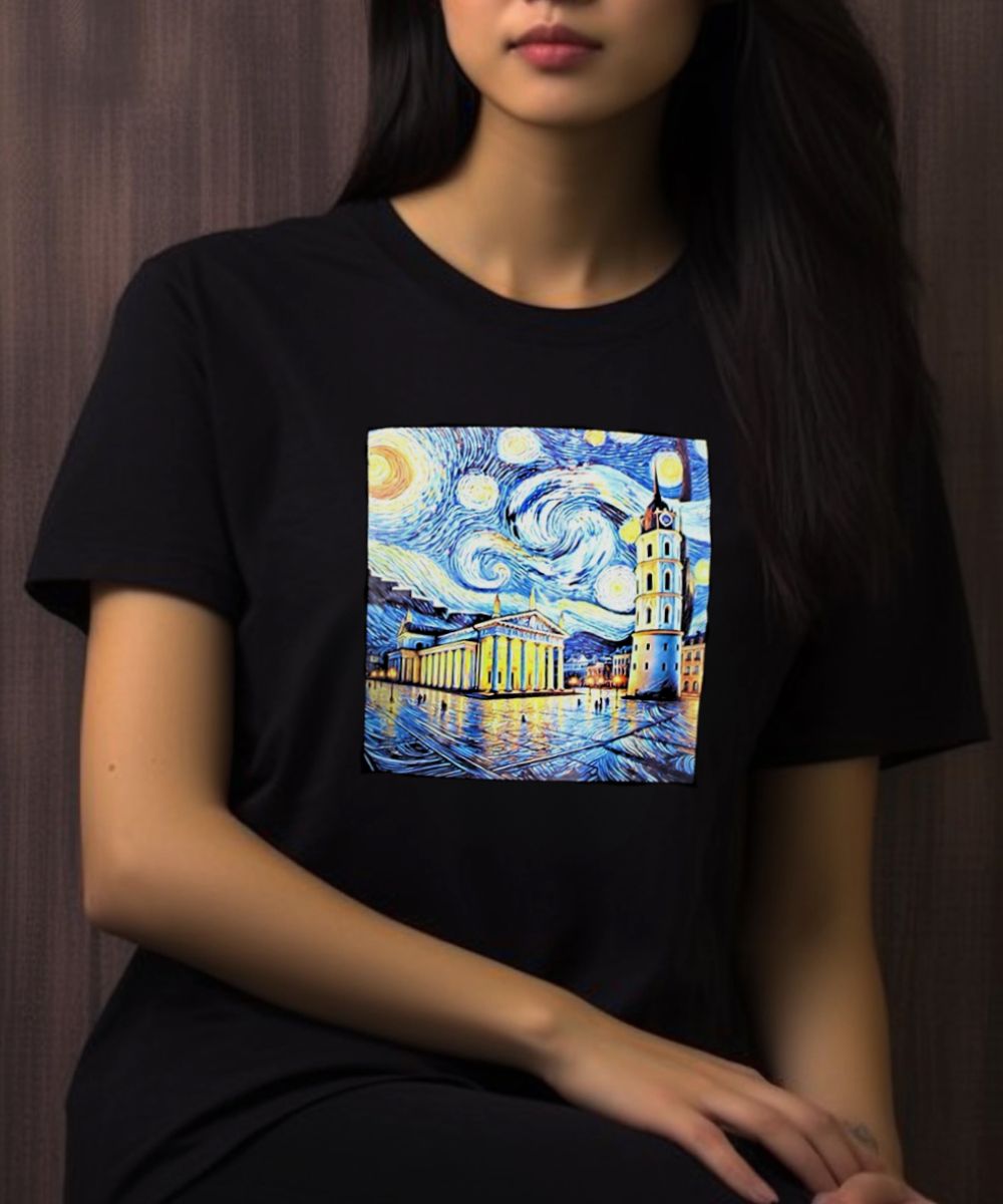 Стылёвая футболка з карцінай у стылі Ван Гога: Сабор пад закручаным зорным небам. Арт-дызайн для гарадскіх рамантыкаў.